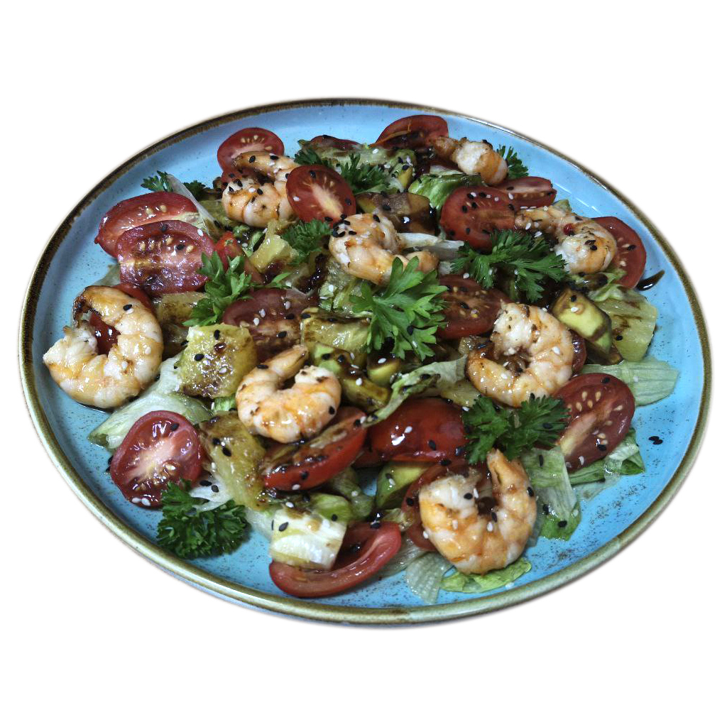 (креветки тигровые, авокадо, апельсин , помидоры черри, зелень айсберг ,масло оливковое, соус Чили, соус устричный, кедровые орехи)